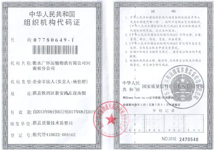 衡水广怀运输物流有限公司河南省公司组织机构代码证